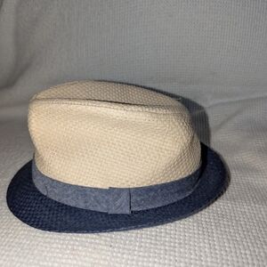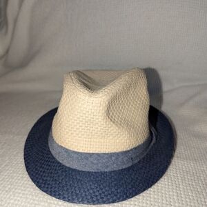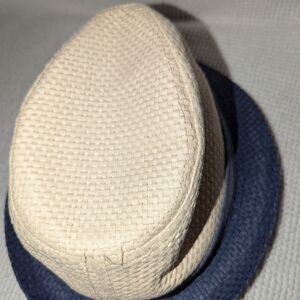 Stylish cream and blue fedora hat for kids. Perfect for adding a touch of charm to any outfit.
