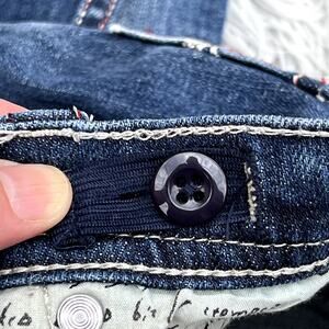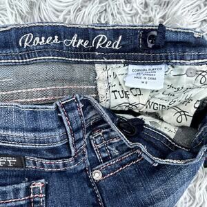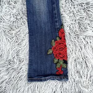Stylish kids' denim jeans featuring vibrant red floral embroidery. Perfect for adding a pop of color to any outfit.