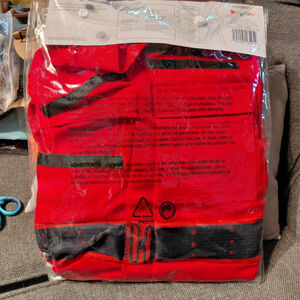 This is a new, packaged Disguise brand "Ghostbusters Frozen Empire" child costume, size S/P (4-6). The costume features a red jacket with black accents and a beige pair of pants, as depicted on the packaging. The front of the package displays the Ghostbusters logo and images of children wearing the costume. The back shows care instructions and safety warnings. The item appears to be in new, unused condition within its original plastic packaging.