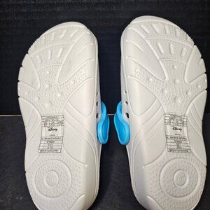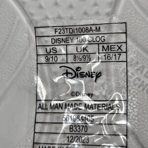 A cute pair of Walt Disney one 100 years, Croc style slip on clogs. These colorful clogs are blue and white, they show Mickey and friends, Pluto on 1 side and goofy and Donald on the other. The design with many colors has the words 100 years on a red banner and confetti and streamers in the background. Raised. 3D design. These shoes were created by Disney in celebration of their 100 years. Kids unisex style and sized US 9/10 or UK 8.5/9.5. Condition is new. Non smoking pet free home.