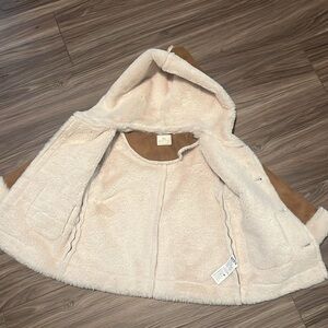 Keep your child warm and stylish with this cozy tan jacket featuring a soft cream lining. Perfect for chilly days. Outer lining feels like suede, inside coat is warm soft fleece- like fabric. Rarely worn, excellent condition, button front and lined hood, size 3T