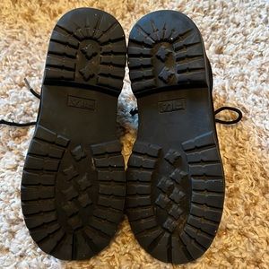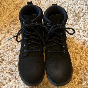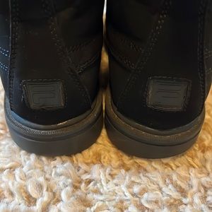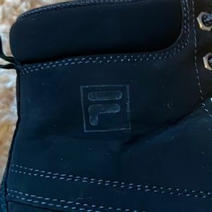 Kids Fila synthetic suede-feel black workboots in good used condition. Suede outer with padded ankle collar and rubber lug soles. Worn on and off for one year, uppers are still in excellent condition, no stains or rips. One lace end is missing an aglet (see last image) and soles have minor wear to the heels. These are still in great condition with a lot of life left Please examine all images.