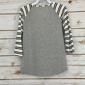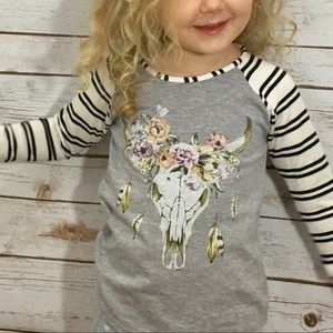 🎀Sizes: Kids 4/5, 6/7, and 8/9 🎀Material: 95% Rayon and 5% Spandex 🎀Description: Made in USA. Long sleeve top with black and white striped sleeves. The main body of the shirt is grey. Graphic on front shows a bull skull with floral crown, and beaded dangling feathers. The model in the pictures is wearing a size 4/5. 🎀Condition: Your top is BRAND NEW, with tags... the model is wearing her own shirt, not the one we will be sending you :)
