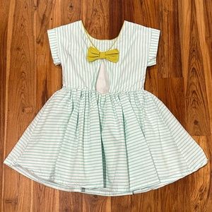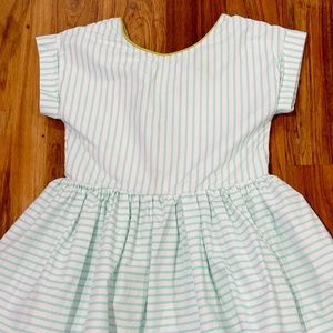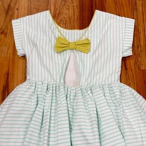 Worn and washed, in good condition. Theres minor discoloration in spots, its hard to see unless youre really looking. A pretty mint green stripe adds a refreshing finish to this sweet open back dress. Scoop neck. Short sleeves with cuff. Open back with bow detail. Allover stripe print. Layered skirt. Shell & lining are 100% Cotton. No trades.