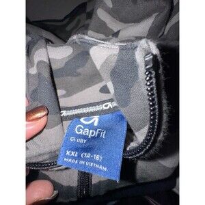 The Kids Gap Army Fatigue Gray/Black Set in size XL 12 is a stylish and comfortable two-piece sweatshirt set for boys. Made from 100% cotton, this camouflage-themed outfit features a gray color with army-inspired details. Perfect for casual wear or playtime, this sweatuit set from Gap is both practical and trendy, making it a great addition to any young boy's wardrobe.