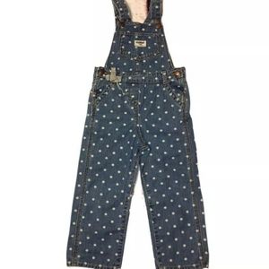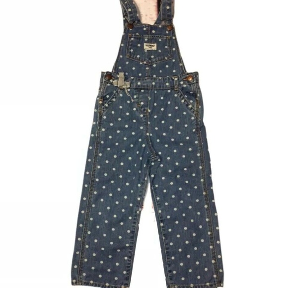 This kids girls Oshkosh B gosh polka dot overalls vestbak 4 T vintage is previously owned in good used condition. It snaps between the legs and buttons on the sides. The shoulder straps are adjustable. No stains or holes minimal use wear and oh so cute!