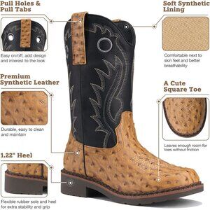 ⚡Kids Girls Brown Ostrich Western Boots Square Toe Cowgirl Boots For Toddler