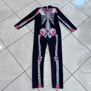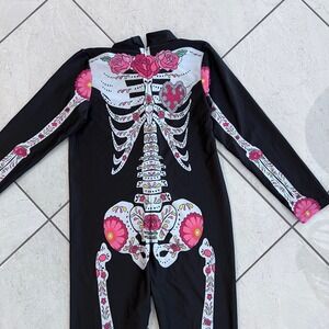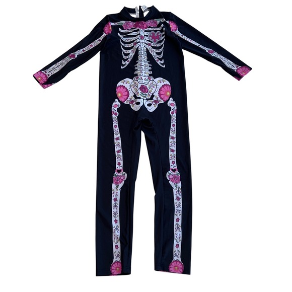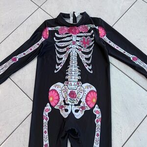 Keywords: Halloween costume, girls costume, skeleton costume, day of the dead, floral skeleton, kids costume, jumpsuit costume, halloween outfit, skeleton jumpsuit, day of the dead costume, party costume, dress up, halloween, size L, long sleeve costume