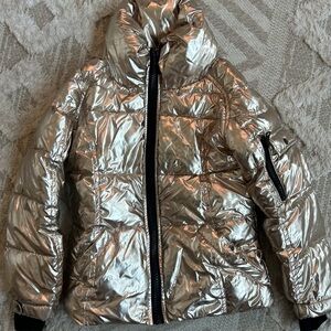 Shiny gold puffer jacket perfect for keeping your child warm and stylish. Features a cozy design with a modern look.