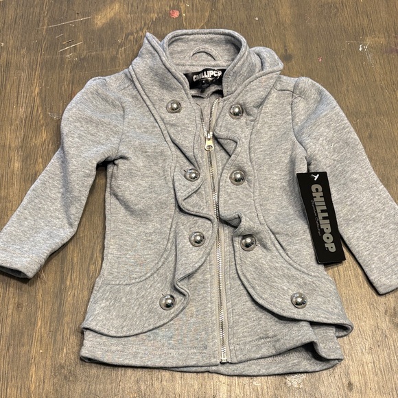 Keep your child stylish and warm with the gray ruffle jacket. Perfect for any occasion.