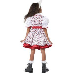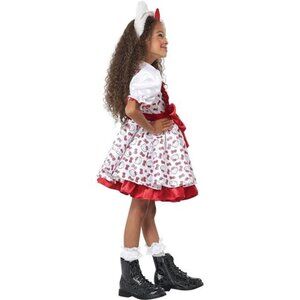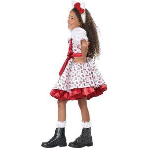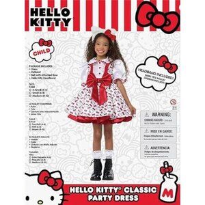 The Hello Kitty Classic Party Dress features a red and white Hello Kitty fabric print. The button-down dress also features a gathered skirt and puff sleeves. It comes with a petti skirt with red trim, headband, and waist band/belt with attached bow. Waist band closes in back with hook and loop fastener. Officially licensed: Sanrio