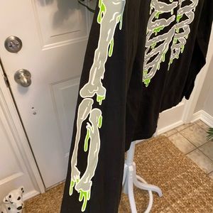 Kids Halloween glow in the dark skeleton with goo T shirt, long sleeves with bones on the sleeves.