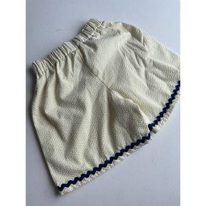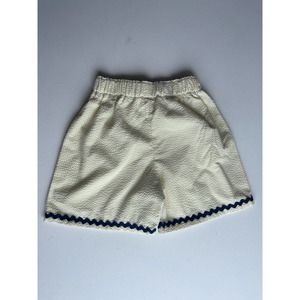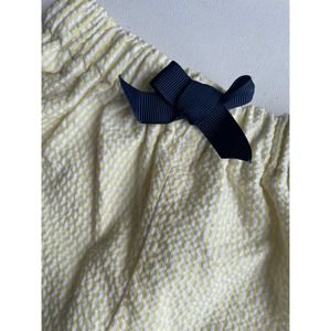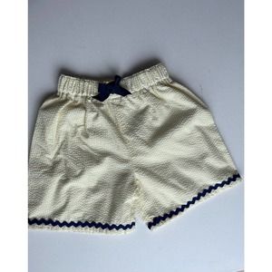 Unsure on the sizing. Yellow striped shorts with navy blue accents. Such a cute handmade piece.