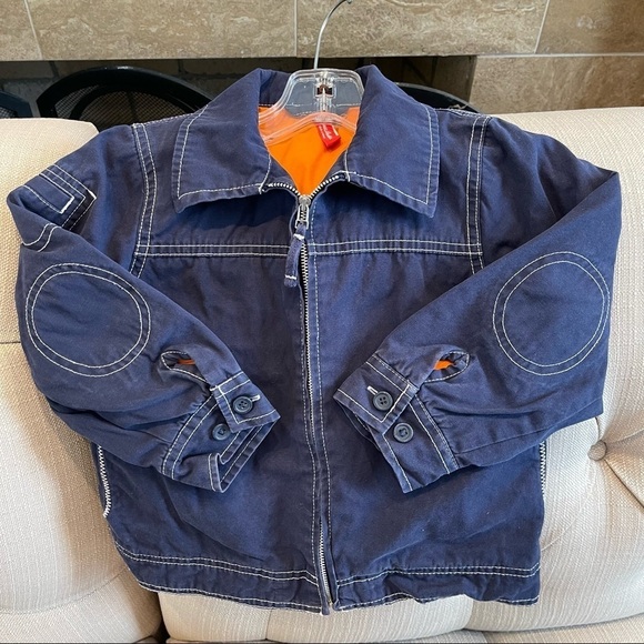 Good used condition Well constructed material like denim but lighter. Stitch elbow patch detailing. Orange Lining small bleach stain on the wrist Little faded from wash.