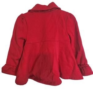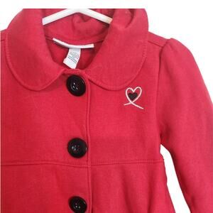 Red girls jacket with front buttons and collar. Heart detail on front. Peplum style. Midweight, unlined.