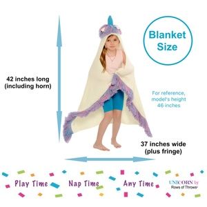 UNIQUE KIDS DESIGN: 42” long (including horn) X 37” wide (plus side fringe). 100% acrylic fabric