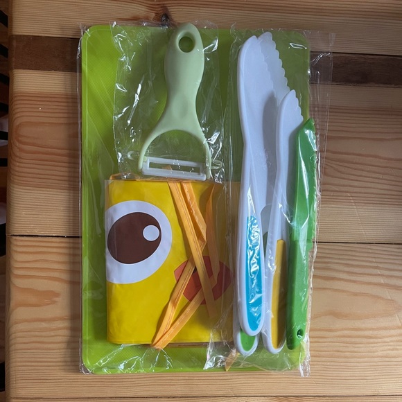 Includes two cutting boards, four knives, one Y peeler, and one apron. Brand new never used.