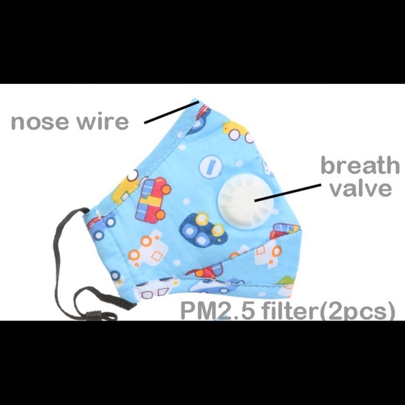 100% Cotton adjustable face mask for children with breath valve and filter as well as nose wire for secure fit.