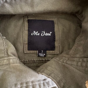 This is a pre-owned Me Jane jacket in size 7, made of 100% cotton. The jacket is olive green with a stand-up collar, a button-front closure, and adjustable drawstring waist. It features two chest pockets with button flaps and two lower flap pockets with button closures. A gold sequined heart patch is attached to the left chest.