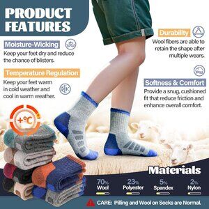 Product details Fabric type 70% Wool, 23% Polyester, 5% Spandex, 2% Nylon Care instructions Machine Wash Origin Imported Pattern Checkered About this item PACKAGE INCLUDED - Here are 6 pairs merino wool hiking socks for kids.They are suitable for hiking , running ,skiing , gym
