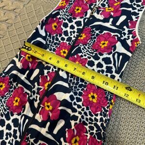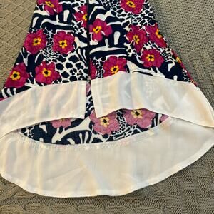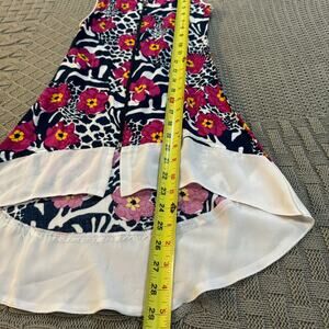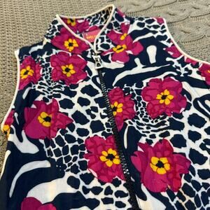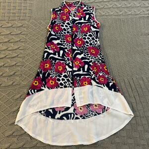 This western dress is gorgeous. Navy blue, pink and white floral pattern with a zip front and animal print background. Can be worn open with layers or zipped up as a dress ~ super versatile in its look. The back on this piece is longer than the front. Tag says size 24, please see measurements to ensure fit as I approximate it to be a 7/8. Please note the small snag on the back, otherwise great used condition.