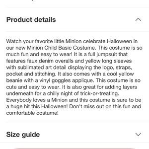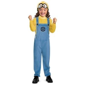 Fun Minion costume for kids. Includes yellow top, blue overalls, and goggles.
