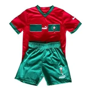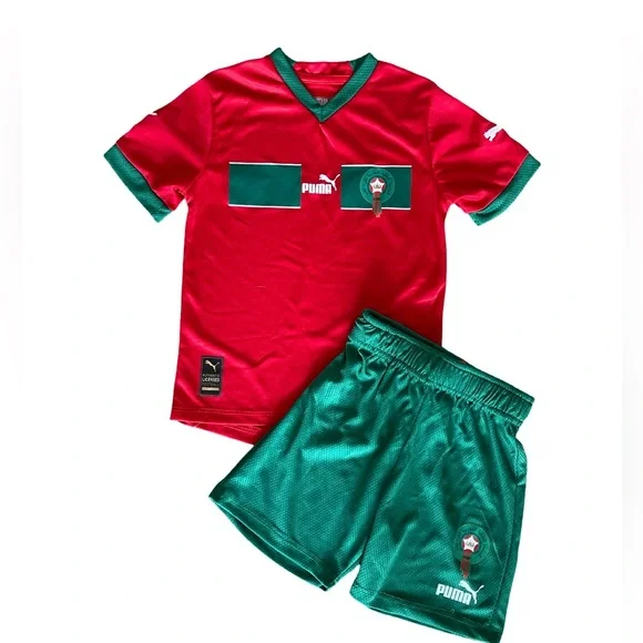 Adorable kids 2022 World Cup kit featuring the iconic red and green colors of the Morocco National Football Team. This two-piece set by Puma includes a performance jersey and matching shorts with the official FRMF crest, perfect for little soccer fans.