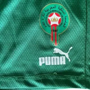 The jersey features Morocco’s classic red design with green trim, Puma logos on the sleeves and chest, and Arabic script across the upper back. The coordinating green shorts include the FRMF crest and Puma logo for a complete team look.
