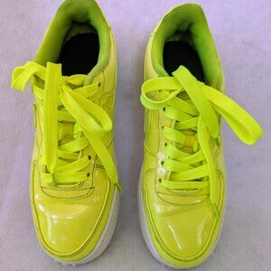 The Air Force 1 LV8 UV PS 'Volt' sneaker is reimagined in kids’ sizing with a bold ‘Volt’ colorway and low-top design. Adding a modern spin on Bruce Kilgore’s 1982 AF1 design—the first basketball shoe to include air cushioning—this Volt iteration is rendered in allover patent with tonal laces and branding. A plush midsole sits above a rubber outsole to comfort and stabilize growing feet.
