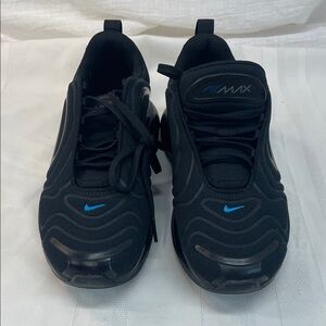 This is a really nice pair of youth boys, Nike black Airmax sneakers. They do not have the insoles that originally came with the shoe you would have to transfer insoles into the shoe at the that they’re in mint condition. !