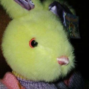 Bunny rabbit plush toy has pink eyes & a cute sweater that has a logo of a butterfly and flowers