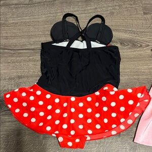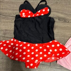 Adorable kids one piece swimsuit set featuring vibrant colors. Includes a black and red polka dot design, a charming purple with pink accents, and a playful blue with colorful patterns. Perfect for fun days at the pool or beach.