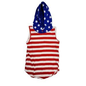 Celebrate in style with this kids' patriotic outfit featuring a red-and-white striped hooded tank and blue star print pants. Comfortable and festive. • Tank top with attached hood • Elastic waistband on pants • Soft and breathable fabric • Eye-catching patriotic print Minor stitching imperfections on seams. Top to bottom of tank = 16 inches. Pants length = 19 inches. @2484morales