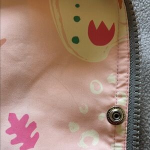This stylish kids rain jacket features a playful pink pattern, perfect for adding a pop of color to any outfit. Designed for comfort and durability. Generally used. Please see photo with minor scratches.