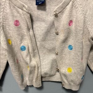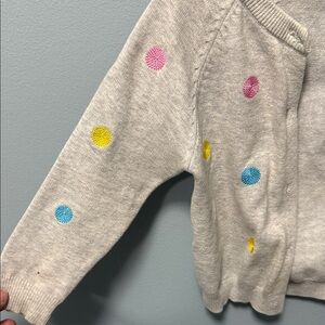 Adorable Kids cardigan featuring a playful polka dot design. Crafted in a soft gray with vibrant pink, blue, and yellow dots, this cozy piece is perfect for adding a splash of color to any outfit.