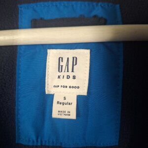 This is a Gap Kids Puffer Jacket in size S, suitable for both boys and girls. The outer shell material is 100% polyester in a blue color, with a lining also made of 100% polyester. The style is a puffer jacket, designed for cold weather. Made with a blended fabric, this jacket is ideal for keeping kids warm and comfortable during the chilly season.