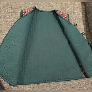 Keep your child warm and stylish with this green quilted vest featuring heart-shaped pockets and button closure. Perfect for layering for cooler days. 100% cotton. It’s handmade product. Suitable for 4-6 years boys. I have more sizes and colors check my other posts. Brand new. Also added Zara vest to give an idea how u can style