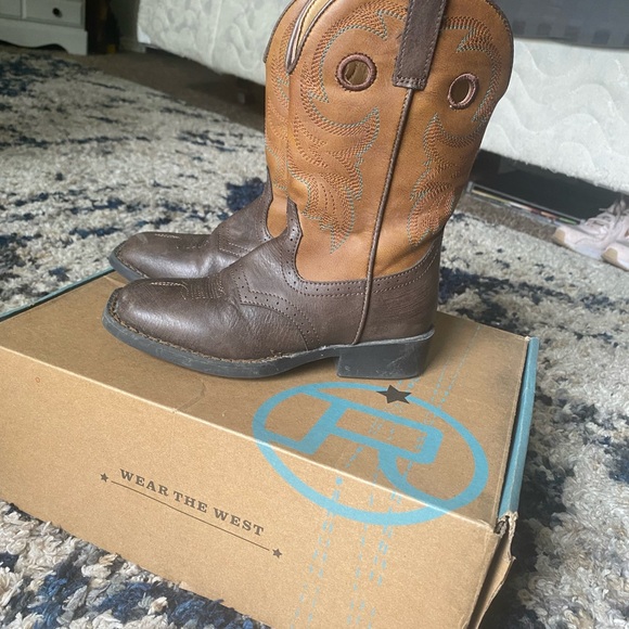 Charming tan boots for kids. Comfortable and durable design. Blue design is a nice touch. Worn once for a wedding because my kiddo was the ring bearer! Comes in original box.