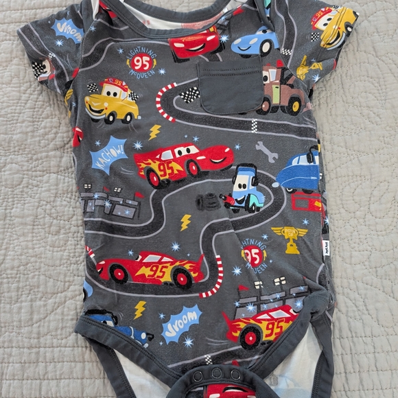 This adorable kids one piece features a fun racing cars design on a gray background. Perfect for little car enthusiasts.