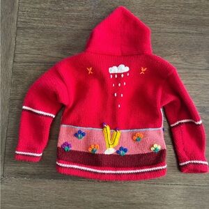 Bright and playful red hooded sweater featuring colorful embroidered designs. Perfect for adding a pop of color to your child's wardrobe.