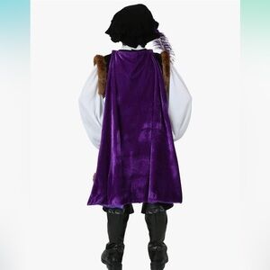 Dress your child in this Kids Renaissance Costume. This outfit features a striking black and purple design, perfect for any medieval-themed event. Includes a faux fur trim, cape, boot covers for a complete look.
