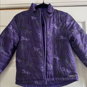 Two times the pony style, this reversible kids winter riding jacket offers cozy comfort with fun designs on both sides! With 100 grams of quilted poly-loft fill, it’s lightweight, packable and provides core warmth perfect for chilly days. The print side features Kerrits’ exclusive “Ride the Wind” design, while the other sports a solid look with a colorful horseshoe graphic. The tall collar and riders-cut hem provide extra coverage in the saddle, while in-seam pockets on both sides keep hands warm and essentials close.