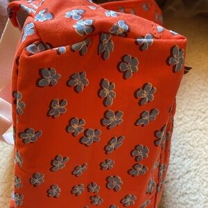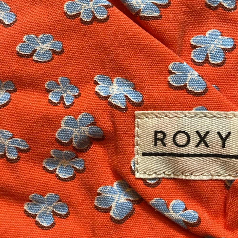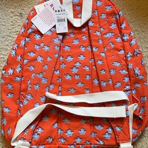 Orange Roxy backpack with cute lt blue flower print. One pocket on outside. About a 4 inches wide bottom, 11 inches side to side, 14 inches tall. Cute for little girls just staring school or light travel.