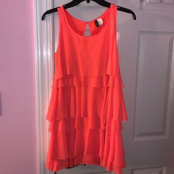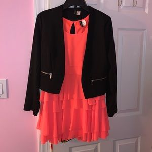 Short kids ruffle dress in a coral color. Is in very good condition and has no rips or tears. Only worn once. Can be worn with a jacket as shown in another listing.