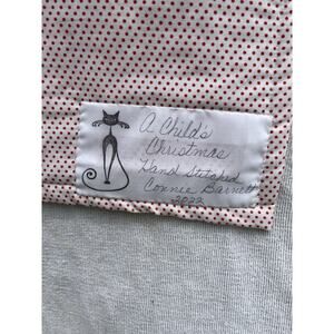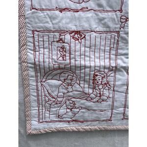 This hand stitched red work embroidery child's Christmas coverlet or wall hanging measures 34 1/2" wide by 41" in length. Fabric feels like a cotton or a cotton blend. The front features red work embroidery in nine different "blocks" each featuring a Christmas scene of children getting ready for Santa. The nine "panel" depictions are in an old fashioned style, harkening back to the 1930s or '40s eras. Backside is white with all over red polka dots.