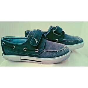 Kid's size 12 gray Nautica boat shoes with hook and loop fasteners. They are pre-owned. See photos for more about condition.