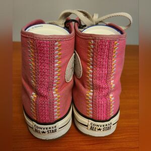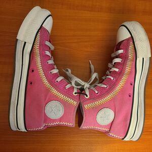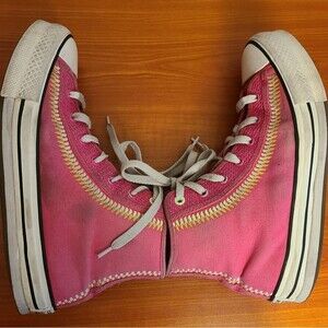 These are pink Converse Chuck Taylor All Star Lift high-top sneakers in kids size 6.5. They feature embroidered accents, lace-up closure, and a casual style suitable for both boys and girls. The shoes have a star theme and a comfortable Eva lift sole. Made by Converse in Vietnam.