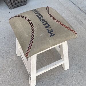 Cloth & leather seat with white washed intentional aged base. Great for a kids room or play room. In VGUC