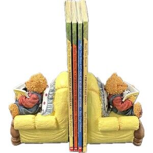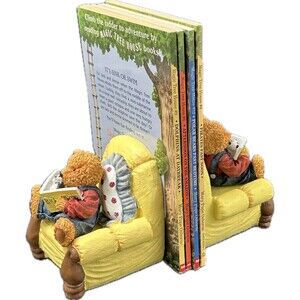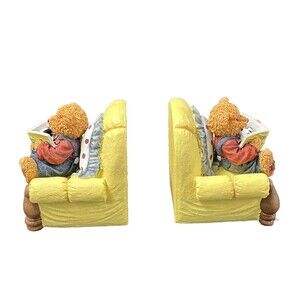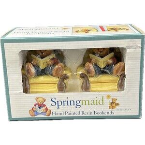 Add a touch of vintage charm to your kids' bookshelf with these Springmaid hand painted poly resin teddy bear bookends. multicolor design will brighten up any room, while the bears adds a playful and whimsical touch. Crafted with high-quality resin, these bookends are durable and will keep your kids' favorite books in place. These bookends are a great gift for any young reader. NEW in Box - Box Dim. (9 1/2"L x 4 1/2"W x 6"H) Teddy Bears sitting in yellow armchairs reading books Bookend Dimensions - 4"W x 3 1/2"H (Each) Only removed from box for inspection and photos Books shown in photos, not included