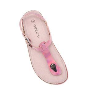 Sprox thong sandals for kids. Color is called rainbow, like an iridescent. Platform base with pink and white stripe. Thing toe. Slip on with adjustable buckle back strap.